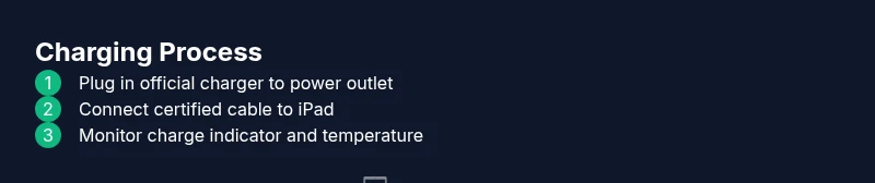 Prepare your setup: a certified charger, a quality cable, and a cool environment. Connect the charger to power, then to the iPad. Place the device on a clean surface, monitor the charging indicator, and avoid covering the back or ports. Let the iPad reach 80–100% before heavy use, then unplug if you’re aiming to prolong battery life.