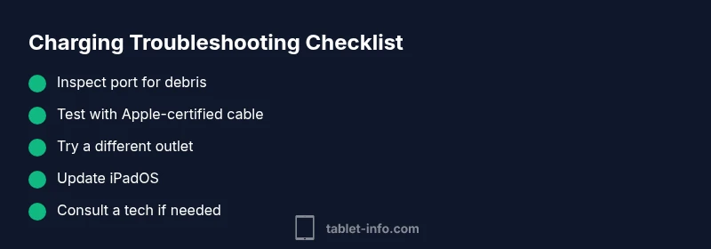 If your iPad can not charge, start with the simplest, safest checks. Examine the charging cable and adapter for wear, testing with a different, Apple-certified cable if possible. Look at the charging port for dust, lint, or a misaligned connector. Try plugging into a different outlet or USB port, and ensure the charger is delivering the correct voltage. A quick reboot after unplugging can clear minor software hiccups. If your iPad still won’t charge, move to the next steps in this guide. Tablet Info notes that these initial checks catch the majority of everyday issues.