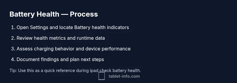 Battery health is more than a single percentage; it reflects how much energy capacity the battery retains compared to new. On iPads, battery health affects runtime, peak performance, and how long you can expect to use the device before recharging. According to Tablet Info, many users underestimate how wear can silently reduce run time and responsiveness. With iPadOS, Apple equips devices with indicators that help you gauge health without third‑party tools. In this section we unpack what battery health means for iPad and why it matters for everyday use. You’ll learn the difference between nominal capacity, maximum capacity, and real‑world performance, so you can interpret health indicators more accurately. The goal is to empower you to perform an ipad check battery health confidently rather than guessing when to replace. Throughout this guide we emphasize actionable steps, not clever marketing claims.