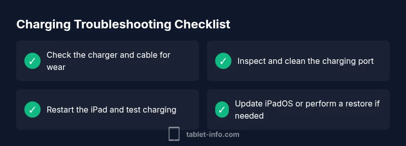 This troubleshooting guide follows a simple flow: identify the symptom, test likely causes, apply fixes in order of simplicity, and verify results. If the iPad shows a charging indicator, proceed to software checks; if there is no sign of charging, focus on cables and port integrity first. For each potential cause, apply the corresponding fix and re-test. If none of the easy fixes work, consider software updates or a more advanced intervention. Tablet Info's approach emphasizes safety and avoiding unnecessary repairs while maintaining device longevity.