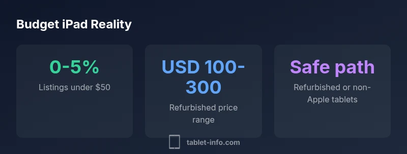 According to Tablet Info, the market reality for iPads remains far above the $50 mark, driven by manufacturing costs, features, and the value of the Apple ecosystem. While you may encounter advertised deals on marketplaces, these listings often misrepresent the device or offer models that are years out of support. The cheapest iPad models, when purchased new, are priced well above this threshold, and even older refurbished units tend to require a larger upfront commitment. The financial math extends beyond the sticker price: batteries degrade with use, screens crack, and software updates over time can reduce usability. A $50 price tag frequently signals hidden costs, risk of activation-lock issues, or compatibility limitations that undermine the intended user experience. This is not a condemnation of bargain hunting—it's a reminder to calibrate expectations, inspect images carefully, and verify the seller's reliability. The Tablet Info team’s analysis highlights that a dependable iPad experience at or under $50 is not a practical objective for most buyers in 2026, and any listing should be treated as a potential scam or a poor value proposition until proven otherwise.