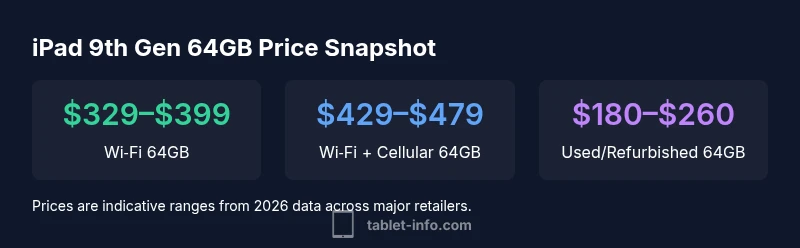According to Tablet Info, the iPad 9th generation 64GB price typically sits in the Wi‑Fi variant around $329 to $399 USD when new, with cellular variants usually higher. In 2026, many retailers offer discounts or refurbished units, and regional pricing can shift due to promotions. Availability varies by color and bundled accessories.