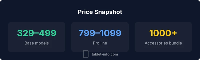 To set expectations, it helps to group prices by iPad family. The base iPad typically sits at the low end of the spectrum, followed by the iPad Air as a midrange option, and the iPad Pro as the premium tier. Within each family, price differences stem from storage options, display size, and cellular capabilities. For example, a base model with Wi‑Fi only and modest storage will be much cheaper than the same family with cellular and expanded storage. This tiered structure means you should map your use case first, then translate that into a target price band rather than chasing the highest feature set.