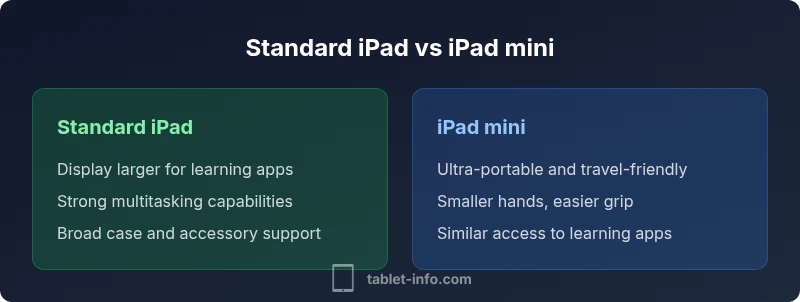 Choose the standard iPad when you want a larger display for learning and multitasking with strong parental controls. Opt for the iPad mini if portability and one-handed use are priorities. Both offer robust ecosystems and safety features, but the decision hinges on how kids will use the device in daily life.