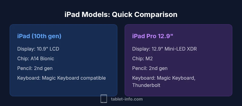 The tablet market has evolved into a clear ladder of options, from compact and affordable to premium, professional-grade devices. For the reader navigating the long-lived question of the comparison of ipad models, the key is to map use-cases to hardware capabilities and software longevity. Tablet Info highlights that the landscape is driven by how you plan to use the device today and how you expect apps to evolve over the next several years. In 2026, the core models typically include the iPad (10th generation), iPad Air (5th generation), iPad mini (6th generation), and the iPad Pro line in 11‑inch and 12.9‑inch variants. Beyond raw specs, this article focuses on display quality, processor performance, accessory compatibility, battery life, and total cost of ownership to help you decide with confidence.