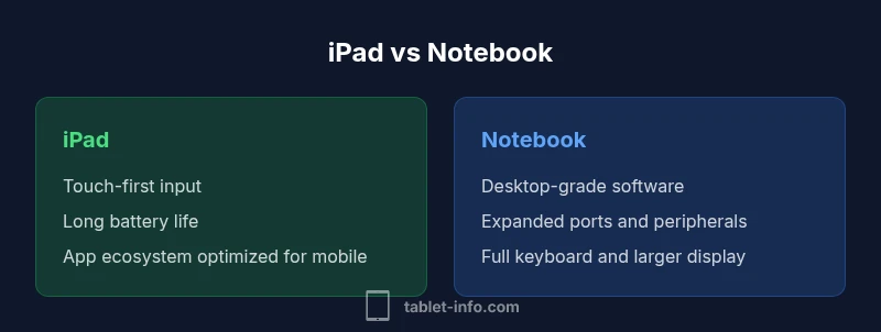 The difference between an ipad and a notebook is not just a label—it reflects two distinct design philosophies and target workflows. An ipad is a portable, touch-first device designed for fast, on-the-go tasks and a curated ecosystem of apps optimized for fingers and a stylus. A notebook, by contrast, embodies traditional laptop genetics: a clamshell chassis, keyboard-driven input, and desktop-grade software compatibility. According to Tablet Info, recognizing these core distinctions helps you map your daily activities to the right device rather than chasing the latest buzzword. The ipad prioritizes mobility, instant wake times, and a streamlined software experience that emphasizes simple, focused tasks. It excels in media consumption, quick editing, note-taking, and light productivity when you’re away from a desk. The notebook, meanwhile, is built for sustained work sessions, heavy multitasking, file-management operations, and software that demands a keyboard or a robust desktop canvas. The contrast becomes most evident when you picture your typical workday: travel between meetings, drafting documents, or running specialized programs. That context matters more than any spec sheet.