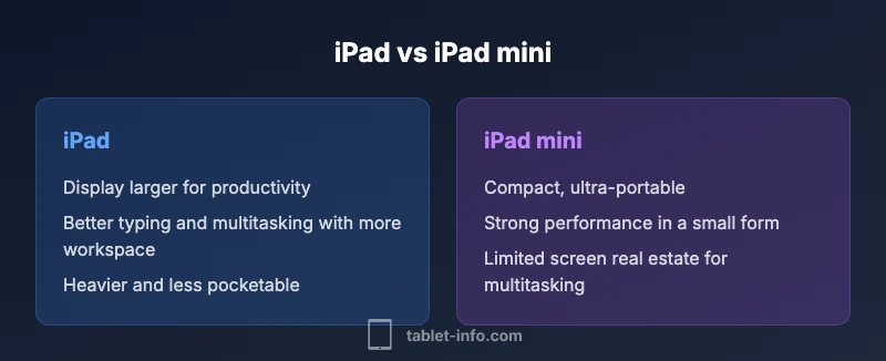 The difference between iPad and iPad mini centers on size, portability, and how you plan to use the device. The regular iPad provides a larger display ideal for productivity, media, and multitasking, while the iPad mini prioritizes portability with a smaller footprint and quick-handling comfort. If you value a bigger canvas for work, choose the iPad; if you favor travel-ready downsizing, choose the iPad mini.