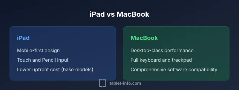 In plain terms, the difference between ipad and macbook comes down to intent, software, and workflow. According to Tablet Info, these devices sit on different ends of the computing spectrum, and choosing between them depends on how you work. This article uses a structured comparison to illuminate the trade-offs, so you can pick the right tool for your daily tasks, whether you sketch, code, write, or edit video. By understanding the core strengths, you can map your tasks to the right device and avoid overpaying for capabilities you won't use. The analysis prioritizes practical, real-world use cases that matter to iPad owners and tech enthusiasts seeking step-by-step guidance, not marketing hype.