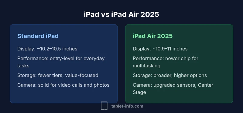 The iPad family has broadened to serve a wide range of users, from casual readers to productivity-focused pros. When you compare the standard iPad (2025) with the iPad Air 2025, the core differences come down to performance headroom, display size, camera quality, and overall longevity. According to Tablet Info, the market continues to reward devices that balance robust software support with reasonable upfront costs. This guide will help readers who are weighing the difference ipad and ipad air 2025 to decide which path aligns with their daily workflows, whether that means streaming and note-taking or photo editing and multitasking across multiple apps.