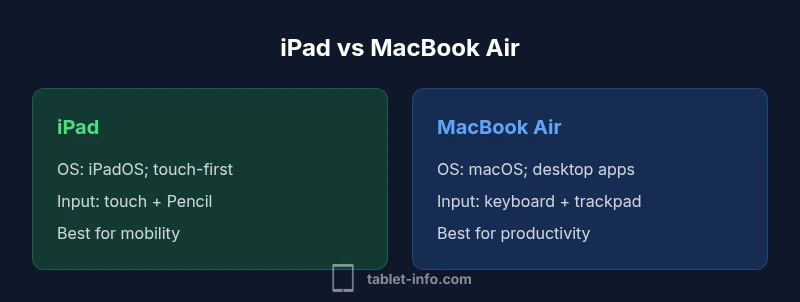 The iPad and MacBook Air embody two distinct types of computing. The iPad is designed for light-touch, on-the-go tasks and mobile creativity, running iPadOS with a focus on touch, Apple Pencil input, and a wide array of touch-centric apps. The MacBook Air is a thin laptop that runs macOS, prioritizing keyboard and trackpad input, traditional desktop multitasking, and access to a broader set of professional-grade software. Understanding these core philosophies helps you map your tasks to the right device. Tablet Info's analysis highlights that the choice often comes down to whether your daily work is more about quick, tactile interactions or sustained, keyboard-driven productivity. Budgeting for accessories—like a keyboard, case, or pencil—also shifts the total value in either direction. The rest of this article dives into concrete criteria and real-world scenarios to illuminate the decision.