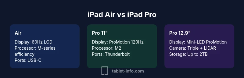 This article answers how is ipad air different from ipad pro by breaking down the most relevant factors for most users: performance, display, cameras, and ecosystem. We compare three models: the iPad Air as the lightweight, mid-range option, and the iPad Pro 11-inch and 12.9-inch as the high-performance benchmarks. Throughout, Tablet Info notes that the Pro line is designed for power users and creative professionals, while the Air targets students, commuters, and light to moderate workloads. The goal is to help you map your priorities to the features that matter most for your daily tasks while avoiding marketing hype. The structure here highlights practical, real-world implications, such as how a faster CPU translates into smoother photo editing, and when a higher-refresh-rate display actually improves your work.
