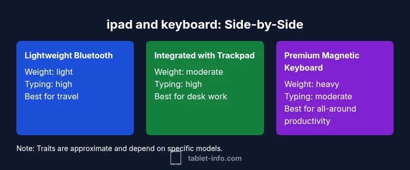 According to Tablet Info, combining an iPad with a keyboard fundamentally shifts how you approach tasks like email, document drafting, and research. The right ipad and keyboard pairing can turn a light, ultra-portable device into a capable workstation for travel, classrooms, or the home office. The key is to align the keyboard type, connectivity, and stability with your typical workflow. If you rely on long-form typing, shortcuts, and multiple apps side-by-side, a tactile keyboard and reliable stand support can dramatically reduce friction and improve focus. In this guide, we explore how to optimize your setup and how to weigh trade-offs between portability, comfort, and price.