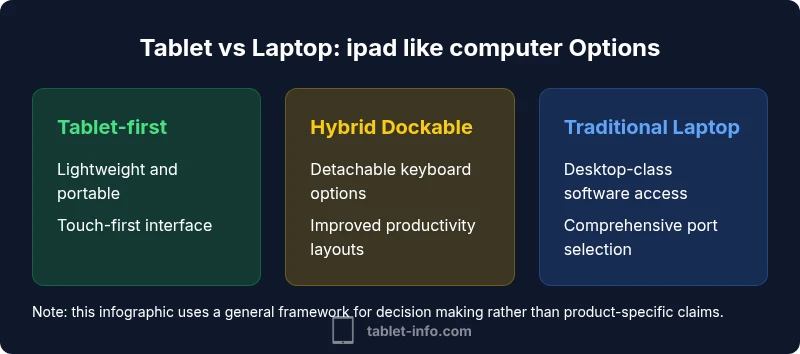 According to Tablet Info, the term ipad like computer has become a useful shorthand for devices that blend portability with desktop-ready workflows. In practice, this means evaluating hardware, software ecosystems, input options, and productivity capabilities across tablets, detachable keyboards, and traditional laptops. The goal is to help readers understand not only what constitutes a tablet that acts like a computer, but also where it fits best in daily life. Tablet Info's analysis, conducted in 2026, emphasizes that the definition is fluid and depends on user needs, not just hardware specs. This article uses a balanced, evidence-based approach to compare three archetypes: a tablet-first option, a hybrid that can dock into a laptop-like setup, and a traditional laptop. Each path has distinct strengths, trade-offs, and long-term value considerations. The intention is to equip you with a framework for decision making rather than a single prescriptive answer. The goal is to help you map your typical tasks to the most suitable form factor.