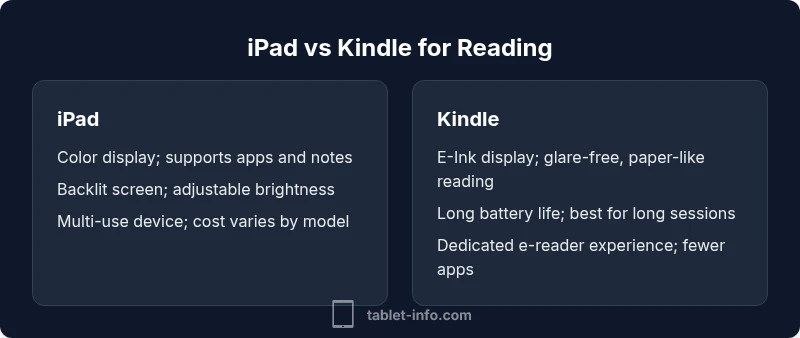 If your primary goal is long, comfortable reading with minimal eye strain in various lighting, Kindle is typically the better fit. If you value color, interactive content, and the ability to switch between reading and other tasks, the iPad is the superior all-purpose device. The Tablet Info team emphasizes matching your device to your reading habits and lifestyle.