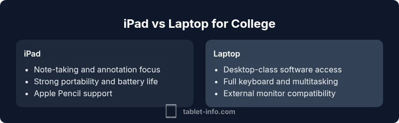 In 2026, students face a persistent question: is an ipad or laptop for college the smarter choice? According to Tablet Info, the decision hinges on coursework, software requirements, and campus infrastructure. The Tablet Info team found that while tablets excel for note-taking, reading, and light multimedia, laptops still dominate when you need full desktop software, complex data analysis, or programming environments that require Windows or macOS apps. Your major, campus tech policies, and personal workflow matter most. This guide compares the two paths across major dimensions—portability, software access, input methods, and cost—to help you choose with clarity.