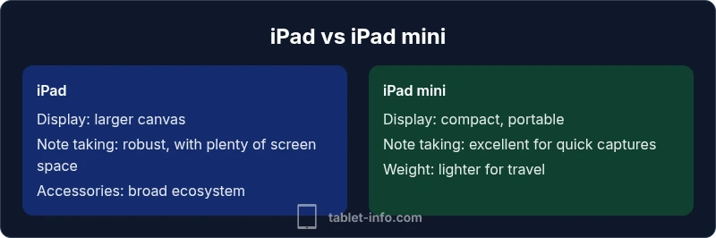 When you see the term ipad versus ipad mini, think about two core questions: how you use the device day to day and where you value your time. This comparison is not about chasing the latest processor bragging rights alone; it’s about practical differences in size, weight, display, and the ecosystem that supports work, learning, and play. The Tablet Info team emphasizes a holistic view: design goals, software compatibility, accessory support, and total cost of ownership all matter. By framing the choice around portability versus a larger work surface, readers can map their priorities to a specific model. In this guide, we will explore how each model handles everyday tasks, from note taking and drawing to streaming, reading, and light gaming, while staying grounded in real world usage and typical buyer needs. The focus remains on a clear, apples to apples comparison you can rely on for a confident decision.