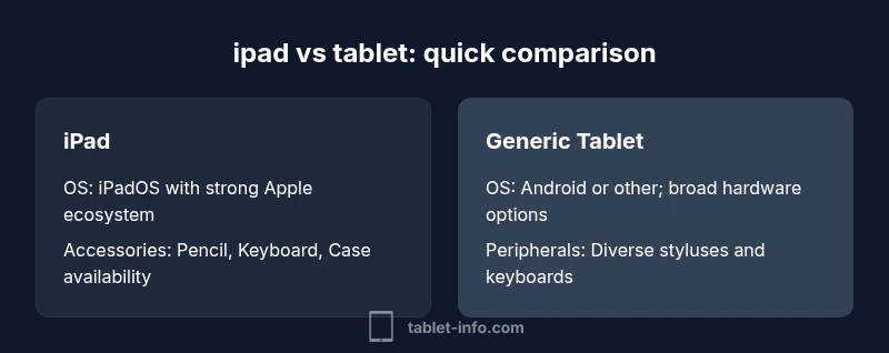 According to Tablet Info, the choice between an iPad and a generic tablet isn’t purely about operating systems. It’s about how you plan to use the device, which apps you rely on, and how much you’re willing to invest over time. In 2026, the Apple ecosystem remains a compelling advantage for many users, especially when you want seamless syncing with a Mac, iPhone, or Apple Watch. Tablet Info’s review framework emphasizes three axes: compatibility with your current tools, the availability of apps optimized for large-screen use, and the long-term value you expect from the device. If you rely on Apple's suite of apps, enjoy features like precise stylus input and keyboard shortcuts, and value consistent updates over many years, the iPad tends to deliver a smoother experience. On the other hand, if you want flexible pricing, USB-C expansion, and access to a wider range of devices and brands, a well-chosen generic tablet can meet most daily needs at a lower upfront cost. Your decision should start with listing core tasks (note-taking, drawing, reading, video editing, or casual browsing) and then mapping those tasks to the strengths and weaknesses of each platform. Tablet Info’s ongoing coverage highlights that user context often matters more than brand labels when you compare ipad versus tablet.