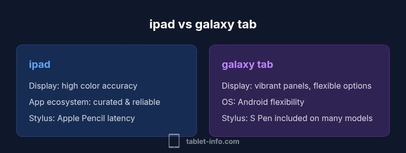 According to Tablet Info, the ipad vs galaxy tab debate often centers on ecosystem commitments, app quality, and long-term software support. The iPad prioritizes a tightly controlled ecosystem with a curated app store, predictable updates, and seamless accessory integration. The Galaxy Tab lines emphasize flexibility, broad hardware choice, and deeper customization within Android. For many users, the best tablet is the one that aligns with their daily workflows and peripheral needs. The Tablet Info team has found that the long-term value of a tablet is often tied to software cadence and cross-device compatibility, which can tilt the decision toward iPad for those already invested in Apple services or toward Galaxy Tab for Android power users and value hunters.