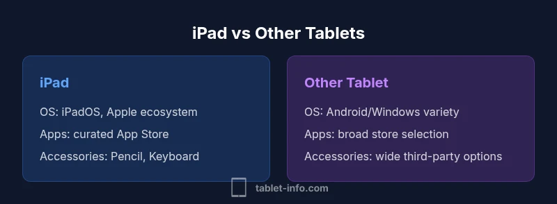 According to Tablet Info, the phrase is ipad and tablet different points to a core practical truth: the iPad is a single product line within a broader tablet category. This distinction matters for developers, educators, and everyday users who rely on app ecosystems and accessory compatibility. By framing the topic around the Apple ecosystem versus generic tablet platforms, readers can begin to see where differences impact daily use, software updates, and long-term ownership. The Tablet Info team emphasizes that the distinction extends beyond hardware; it shapes software design, user expectations, and cross-device workflows that influence how people create, learn, and stay connected.