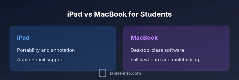 Is the question is ipad better or macbook for students? answered by analyzing study styles, software needs, and campus routines. According to Tablet Info, the best choice hinges on how you learn and what programs you must run. If you frequently annotate PDFs, sketch ideas, or study on the go, the iPad — especially with an Apple Pencil and a lightweight keyboard — can be a nimble companion. If your coursework relies on desktop-grade software, larger writing projects, or software development, a MacBook often delivers a smoother workflow. This is not a one-size-fits-all decision; the right device aligns with your syllabus, commute, and study habits. The Tablet Info team found that a hybrid approach—using an iPad for quick notes and a MacBook for longer assignments—is common among students who want flexibility and power in one学 student’s toolkit. When you plan your budget, consider long-term software needs and potential device upgrades, as those factors strongly influence overall value over the course of a degree.