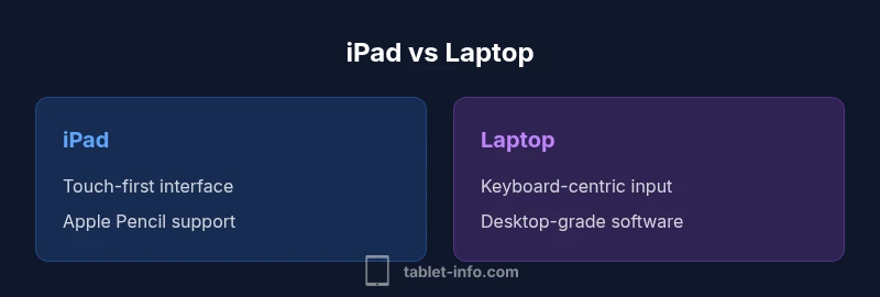 The question “is ipad the same as a laptop” reflects a common consumer dilemma, but it hinges on how you define portability and productivity. According to Tablet Info, a laptop is typically a clamshell computer with built-in keyboard, trackpad, and a desktop-oriented operating system designed for long-form work at a desk or on the move. An iPad, by contrast, is a tablet that runs iPadOS and emphasizes touch input, gestures, and an app ecosystem optimized for touch. Accessory options such as the Magic Keyboard or Apple Pencil can blur the line, yet the core architecture remains distinct. This article focuses on practical workflows, not just form factor, to help you judge whether the iPad can reasonably substitute a laptop for your daily tasks. The distinction matters because OS capabilities, app availability, multitasking behavior, and peripheral support shape real-world outcomes. Tablet Info’s analysis emphasizes that the best choice depends on how you intend to create, collaborate, and study, rather than the device’s physical appearance alone.