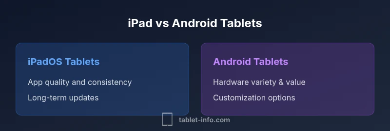 Choosing between tablet ipad vs android begins with ecosystems. iPadOS and Android both offer app stores, cloud integration, and accessory ecosystems, but their philosophies diverge. According to Tablet Info, the iPad ecosystem emphasizes polish, long-term support, and seamless integration with Mac and iPhone hardware, while Android tablets prioritize flexibility, customization, and pricing options. The Tablet Info team found that most professional creators lean toward iPad for apps like Procreate and LumaFusion, while power users value Android for hardware variety and cross-device compatibility. If you’re deciding, define your primary workflows, then map them to ecosystem strengths. In daily use, this foundational choice shapes app behavior, device longevity, and how you mix work with entertainment. The phrase tablet ipad vs android often surfaces early in conversations, but the real decision comes down to how you plan to use the device over years, not months.