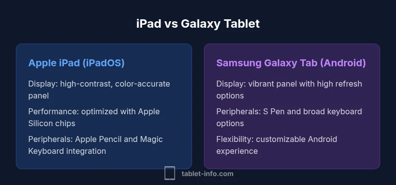 According to Tablet Info, the tablet market in 2026 remains polarized between Apple's iPad line and Samsung's Galaxy Tabs. The iPad continues to dominate professional creative workflows due to industry-standard apps and a polished OS, while Galaxy Tabs attract users who want broader hardware variety, flexible pricing, and closer integration with Google's Android ecosystem. When evaluating tablet ipad vs samsung, consider core strengths: ecosystem depth versus hardware versatility, app quality versus customization, and longevity versus upfront cost. In real-world terms, note-taking, drawing, media consumption, and light productivity often reveal the practical gaps between the platforms. Tablet Info's long-form analysis highlights that the best choice hinges on your priorities for software continuity, accessory ecosystems, and total cost of ownership over time.