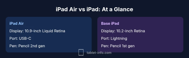 What is iPad Air vs iPad? This head-to-head comparison highlights the key differences in display, performance, and ecosystem. According to Tablet Info, the iPad Air typically offers a newer chip, a larger and brighter screen, and broader accessory support than the standard iPad, but at a higher price. For students or casual users, the base iPad remains a strong, budget-friendly option. Read on for a detailed, side-by-side analysis that covers real-world usage and value.