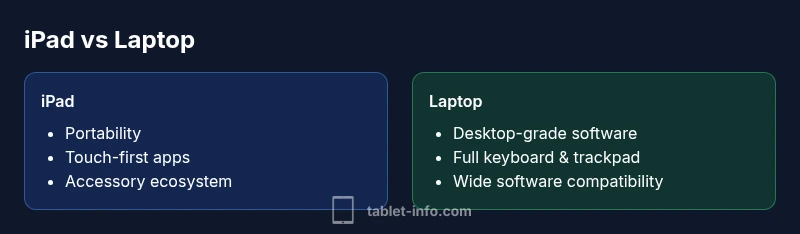 According to Tablet Info, the question of whether to rely on an iPad instead of a traditional laptop hinges on how you prioritize portability, battery life, software availability, and task scope. The phrase why ipad over laptop encapsulates a practical decision: can a tablet meet your daily demand without sacrificing critical desktop capabilities? This guide analyzes the core axes of comparison—performance, ecosystem, input, and value—so you can make an informed choice aligned with your workflow. From everyday note-taking to occasional content creation, understanding these factors helps you avoid a one-size-fits-all solution. Tablet Info’s early findings suggest that most lightweight users who prioritize quick access and mobility gain with the iPad, provided their software needs aren’t tethered to specialized desktop applications.