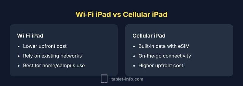 According to Tablet Info, the core distinction between a Wi‑Fi iPad and a Cellular iPad is how they connect to the internet. A Wi‑Fi model uses only local wireless networks, while a Cellular model includes built‑in cellular radios and an eSIM (or SIM) that lets you connect to mobile data when Wi‑Fi isn't available. In practical terms, this means the difference between working entirely where there is a hotspot or campus network and being able to work anywhere there is cellular coverage. Tablet Info analysis highlights that most users at home or school rely on Wi‑Fi, while field workers and travelers benefit from cellular connectivity, especially on long trips or in areas with scarce public Wi‑Fi. The choice often comes down to your mobility pattern, budget, and how often you need reliable internet away from known networks.