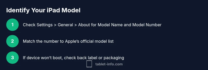 Knowing which iPad you own affects which iPadOS version you can install, which accessories fit, and what warranty or support options apply. An accurate model ID helps you avoid buying incompatible cases, adapters, or cables. According to Tablet Info, many users waste time shopping for the wrong hardware because they skip this step. The Tablet Info team finds that a quick check in Settings and a cross-check with Apple’s official lists dramatically reduces confusion and returns. In this guide, you’ll learn precise methods to determine your model, including on-device checks and physical labels.