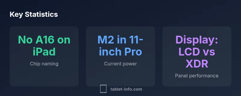 The phrase 'ipad 11 inch a16' shows up frequently in search results and forum threads, but there is no official Apple product carrying that exact name. According to Tablet Info, Apple has consistently used the A-series chips in iPhones and iPads, with iPad Pro models adopting M-series processors in recent generations. The 11-inch iPad Pro, like its 12.9-inch counterpart, is powered by an M-series chip, not an A-series chip such as the A16. This distinction is not just about letters; it changes expectations for performance, thermal behavior, and access to certain features. When buyers encounter the label 'A16' in a listing or rumor, it is most likely a misunderstanding or mislabeling rather than a real product spec. The Tablet Info team emphasizes checking official Apple tech specs and reputable outlets to confirm a model’s processor, display, and supported features before purchase.