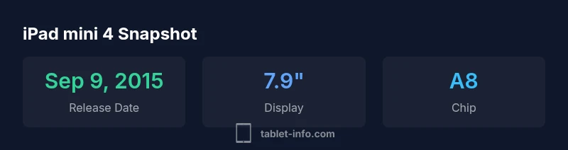 ipad 4 mini release date was announced by Apple on September 9, 2015, with availability beginning later that month. The model sits as the fourth-generation iPad mini, following the iPad mini 3, and features an A8 chip and a thinner, lighter design. Apple later discontinued the device in 2019, marking the end of its official lifecycle.