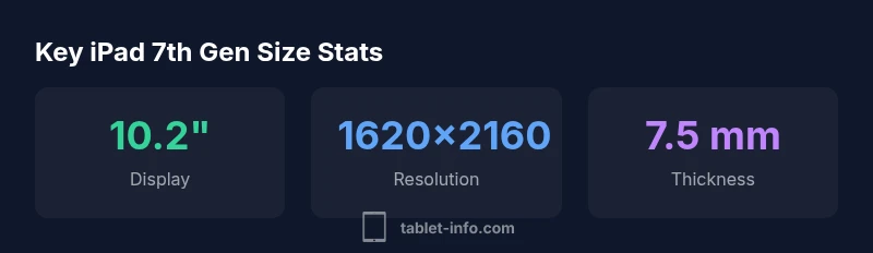 According to Tablet Info, the ipad 7th generation size centers on a 10.2-inch Retina display, a resolution of 1620 x 2160 pixels, and a compact footprint suitable for one-handed use and on-the-go productivity. The display delivers sharp text and vibrant media, with a pixel density of about 264 ppi. The overall design keeps a thin profile while maximizing screen real estate for writing, browsing, and multimedia. For reference, the device dimensions are commonly cited as roughly 9.8 inches wide by 6.8 inches tall, with a thickness of about 0.29 inches (7.5 mm). This form factor has made the 7th generation a popular choice for students and professionals who want a portable canvas for note-taking and light tasks. The weight varies slightly by model, but the Wi‑Fi variant sits around 490 grams, with cellular versions close to that mark depending on the radio. In real-world use, this translates to a very manageable carry in a bag or backpack.