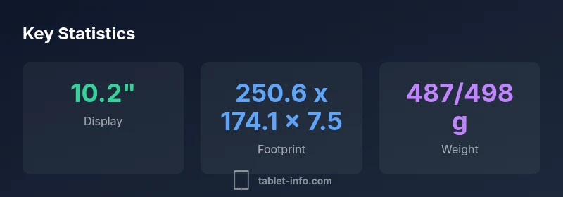 | iPad 9th Gen | 10.2 inches | 250.6 x 174.1 x 7.5 | 487 (Wi‑Fi) / 498 (cellular) | Wi‑Fi and cellular variants; same footprint as 8th gen |