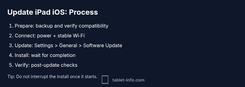 Before you tap the upgrade button, take five essential steps to protect data and ensure a smooth process: back up, check compatibility, free storage, ensure power, and pick the right update path. Backups protect photos, messages, documents, and app data should something go wrong. Compatibility largely depends on your iPad model and iOS version; skip updates that require hardware you do not own. Free storage is critical; most updates need space to unpack and install; if storage is tight, offload unused apps, delete large files, or move photos to iCloud. Connect to a reliable Wi‑Fi network to avoid interruptions, and keep your device connected to power during the entire process. If you rely on specific apps for accessibility or work, consult their support pages for compatibility notes. Tablet Info recommends a plan that includes a backup, a storage check, and a power source to minimize surprises. Also verify that your Apple ID is accessible and up to date; a login issue can block downloads during the update. This planning also helps with update ipad ios consistency, avoiding mid-process stalls.