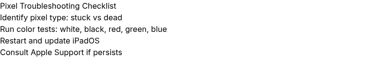 Step 1: Restart and update. Power down, then restart the iPad, and install any available iPadOS updates. Step 2: Reset display-related settings. Go to Settings > Display & Brightness and reset to defaults where possible. Step 3: Run a pixel-fix loop or color sweep. Use full-screen color tests (white, black, red, green, blue) in a continuous cycle for several minutes. Step 4: Gentle physical test (with caution). If you’re comfortable, very gently tap around the affected pixel with a soft microfiber cloth while the device is off or on a locked screen to help dislodge a stuck subpixel; stop if you notice any adverse effect. Step 5: Check for apps or features that could affect pixels. Disable True Tone and Night Shift to avoid color bias during testing. Step 6: If the pixel persists, back up data and contact Apple Support or an authorized service provider for hardware inspection or screen replacement options. Step 7: Consider extended coverage. If under warranty or AppleCare, request official diagnosis before any service to preserve coverage. Step 8: Document outcomes. Note dates, steps taken, and results to aid future troubleshooting and decision-making.