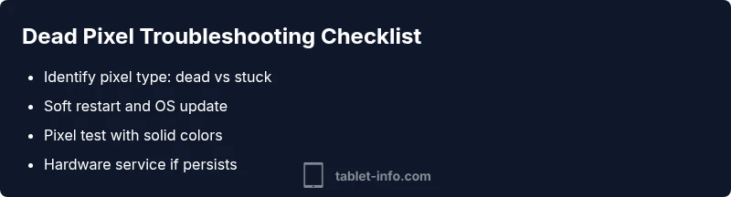 A dead pixel ipad pro refers to a single pixel that remains dark while the rest of the screen shows color. On modern OLED/LCD panels, one dark dot can be highly noticeable in any app or home screen. While some users call this a defect, it is crucial to distinguish a truly dead pixel from a stuck pixel that can recover. The Tablet Info team notes that many initial pixel issues are software-driven or transient, making quick checks worthwhile before more drastic steps. Hardware faults exist but are less common in the early lifecycle of an iPad Pro. Understanding the difference helps you decide between software remedies and hardware service.