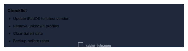 If you suspect infection, start by removing rogue profiles, uninstalling suspicious apps, and updating iPadOS. Back up data before deeper fixes.