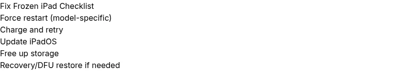 ipad is frozen? Start with the simplest fix: force restart by pressing and holding the appropriate buttons until the Apple logo appears. If that fails, charge for 15–20 minutes, then retry. If the screen remains unresponsive, open Settings > General > Software Update, and consider a recovery-mode restore as a last resort.