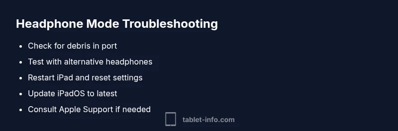If basic fixes fail, perform a deeper test to differentiate hardware vs software causes. First, try a different pair of headphones or a USB-C/Lightning adapter to rule out a faulty cable. Then, test audio with Bluetooth speakers to observe whether routing remains stuck on headphones. Use Recovery Mode only if you have a full backup, as it reinstalls iPadOS and can take time. If after a clean OS reinstall the issue remains, the problem is almost certainly hardware—likely the detection switch or port—requiring professional service. Tablet Info recommends isolating the fault with controlled tests before attempting hardware repair.