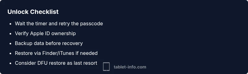 - Check the exact message text and timer. 2) If you know the passcode, wait for the timer to clear and try again. 3) If you forgot the passcode, sign in with your Apple ID to verify ownership and unlock via Find My iPad (if supported). 4) Backup data if possible, then consider Recovery Mode or DFU restore as a last resort. 5) After any restore, set up your iPad from a backup and re-enable Find My iPad.