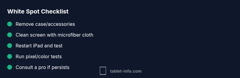 According to Tablet Info, learn how to diagnose and fix a white spot on the iPad Pro 10.5 screen with a safe, step-by-step flow, practical checks, and when to seek professional repair.