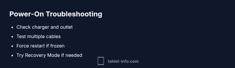 According to Tablet Info, the most common reasons an iPad won’t power on are battery depletion, a faulty charging setup, or a frozen software state. Other frequent culprits include a hardware button failure, a damaged display, or water exposure that damages the internal circuitry. Older iPad models tend to develop degraded batteries over time, making a simple press of the power button insufficient to wake the device. The key is to distinguish between a completely dead device and a device that powers but shows no screen, which requires different fixes. Understanding these scenarios helps you prioritize the right steps and avoid unnecessary repairs.