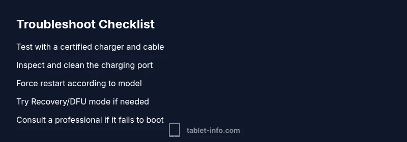 According to Tablet Info, when an iPad won't turn on or charge, the issue is almost always tied to power: a completely drained battery, a faulty charger or cable, or a port blocked by lint. This quick reality check helps you avoid chasing rare hardware faults. Start with the simplest steps, then move to more thorough checks. The goal is to identify whether the device is alive enough to respond to basic signals: a dim screen glow, a soft vibration, or a charging indicator. If you see none of these, proceed with the diagnostic flow and step-by-step fixes in this article. Remember: safety first—never insert metal objects into the port, and unplug from a power source before inspecting the hardware.