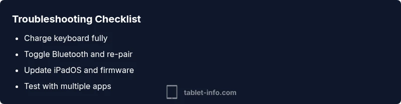 When a Logitech keyboard stops working on an iPad, it can disrupt a lot of workflows, from writing emails to taking notes in meetings. The core issue usually boils down to how the device communicates with iPadOS. The phrase logitech keyboard not working for ipad captures a common scenario where Bluetooth pairing, power status, or software compatibility is at fault. According to Tablet Info, many users rely on reliable keyboard input to stay productive, and a quick, structured approach can restore function in 2026 as on prior years. In most cases, the fix is straightforward and involves checking power, re-establishing a Bluetooth link, and ensuring software compatibility with the latest iPadOS. This section sets the stage for a practical, step-based fix path that minimizes downtime and data loss.