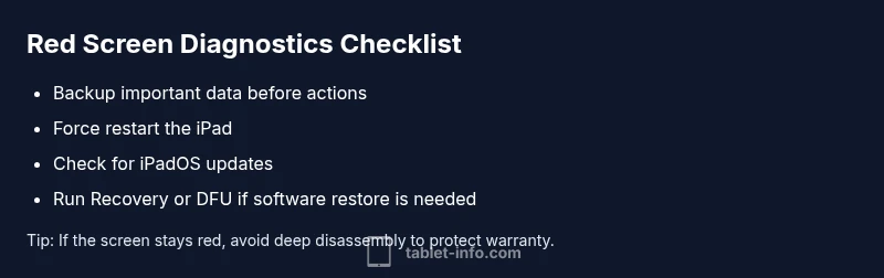 The red screen of death on iPad is a critical symptom that appears when the system encounters a fault it cannot recover from, often signaling a kernel panic or severe software/hardware fault. According to Tablet Info, many cases stem from software glitches, unstable updates, or corrupted caches, but hardware faults can't be ruled out. Start by safe-checks, then proceed through a systematic flow to isolate software versus hardware causes.