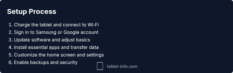 Before you begin, ensure the device is charged and you have a stable Wi‑Fi connection. Sign in with a Samsung account or a Google account to sync apps, contacts, and settings. Update to the latest OS version to access new features and security patches. If you already own other Samsung devices, enable Quick Share and Samsung Cloud to streamline data transfer and cross-device continuity. Tablet Info highlights that a clean, current setup reduces friction when you install apps and transfer data later on.