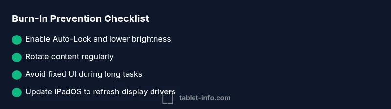 Burn-in on iPad is often misunderstood. While traditional OLED burn-in is rare on LCD panels, image retention can occur after long sessions with static UI, fixed toolbars, or logos. Prolonged brightness at high contrast accelerates pixel fatigue, especially if you routinely display the same content in the same place. In practice, most “burn-in” cases are temporary image retention that fades after the device refreshes pixels or after you vary the screen content. Tablet Info analysis shows that regular content variation and cautious usage patterns dramatically reduce the risk, but persistence beyond a few minutes should be monitored. Do not panic: many cases improve with simple changes in how you use the screen and by giving the panel a rest.