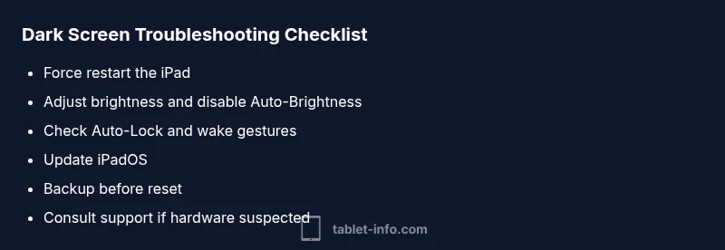 According to Tablet Info, the question of what causes ipad screen to go dark often boils down to software glitches, settings, or a backlight/connection fault. A dark screen may not mean a dead device; many times it’s a wake issue or a simple setting. By distinguishing between software and hardware contributors, you can tailor your approach and avoid unnecessary repairs. Tablet Info analysis shows that most issues stem from software or misconfigured settings rather than permanent hardware failure. The keyword what causes ipad screen to go dark should appear naturally in your exploration to reinforce the topic for search engines and readers alike.